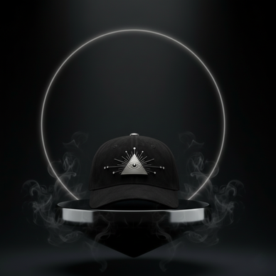 El diseño frontal se siente preciso, equilibrado y ritual, con líneas que irradian desde el símbolo central, evocando visión, conciencia y control. Cada trazo está pensado para transmitir misterio y autoridad sin caer en lo obvio.